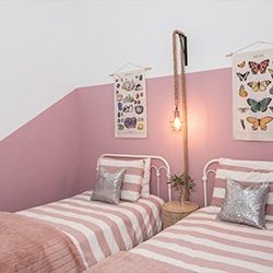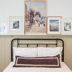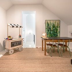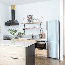 The first floor is 1150 sq ft and the lofts and playroom a combined 288 sq ft. I had some major concerns prior to moving in. I was very worried being a family of five and only having a 24” refrigerator, the size of the closets and kitchen storage space in general. After moving in, those concerns quickly disappeared. I grocery shop once a week and I’ve never had an issue fitting everything in the fridge. The only change I made was buying smaller size condiments. We have really minimized our clothes and gotten down to kitchen essentials. If something was a must-have or multi-functional it stayed. A set of vintage lockers acts as our “mudroom”, all the backpacks, lunch boxes, jackets, etc. are stored within easy reach but out of view. A large pink cabinet made by my dad houses our collection of scales from travels, glassware passed down from my grandmother and additional kitchen storage.