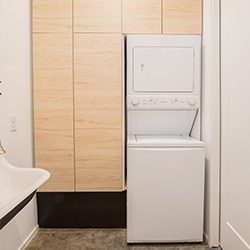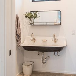 The bathroom works double duty as the bathroom and laundry room and features a cast iron wall-hung sink and an entire wall of storage.