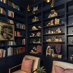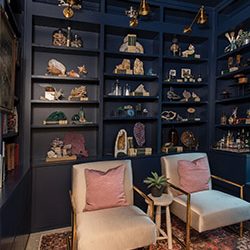For me, it was a library with a Harry Potter theme. I am a collector, treasure hunter, and avid reader. It was really important to have a quiet retreat where I could house all of my books and proudly display all of my collections. With floor to ceiling cabinetry painted navy, brass library lights and metallic gold stars on the ceiling, this room is totally unexpected and a menagerie of books and oddities alike. I fell in love with reading in the 4th grade and I grew up reading Harry Potter and waiting for each book to come out and then each film. For me, Harry Potter is really the ultimate example of just how magical reading can be. I proudly displays my very first copy of “The Sorcerer’s Stone” in a lucite box on the wall. The copy is noticeably tattered and well-loved.